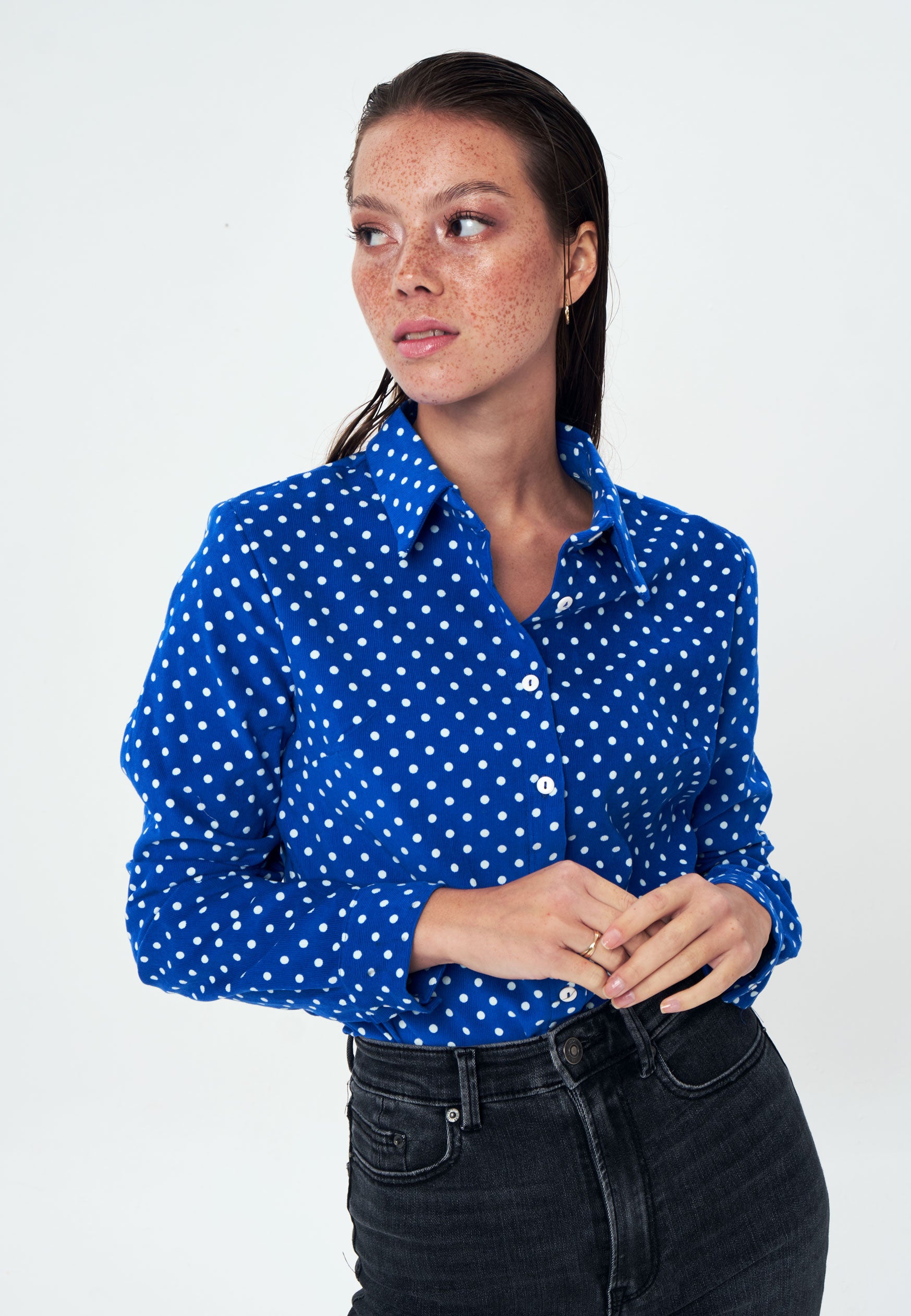 Herita Velvet Long Sleeve Shirt Blue white polka dot